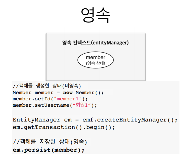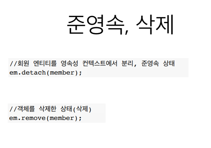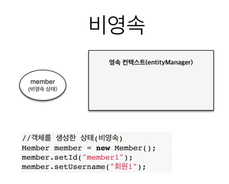 비영속상태는 멤버 객체를 생성하고 내가 엔티티매니저에 아무것도 안한상태. JPA에 관계없이 객체만 생성한 상태.