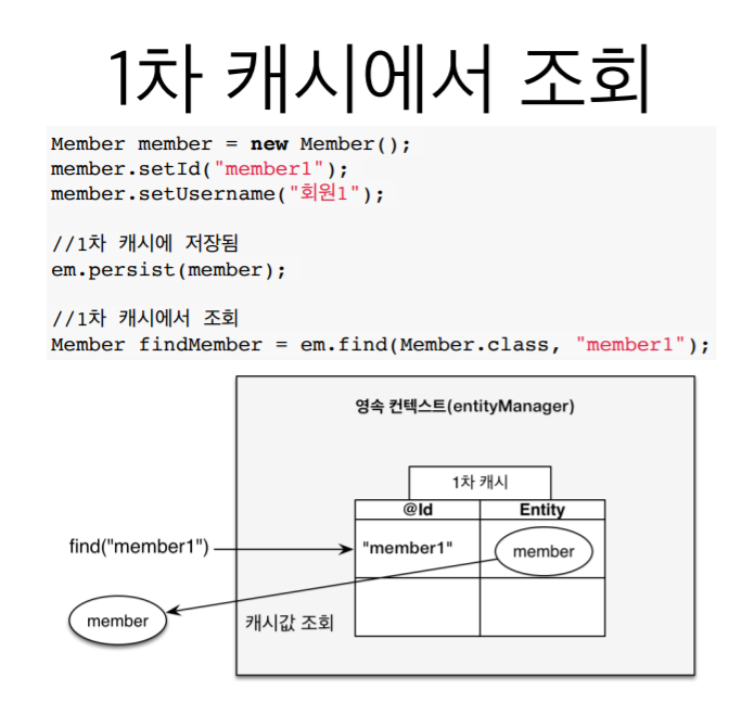 조회시에는 바로db에 가서 조회 해오는게 아니라 1차 캐시에 있는지 확인해서 있으면 1차 캐시에서 조회해옴.