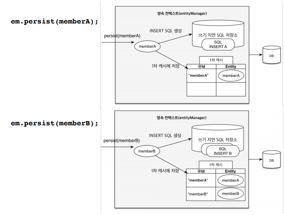 em.persist(memberA); em.persist(memberB);할때 insert문을 데이터베이스에 보내는게 아니라 커밋하는 순간 데이터베이스에 INSERT SQL을 보낸다