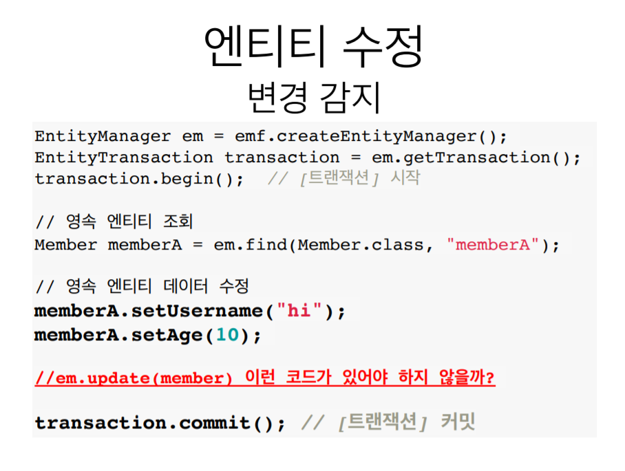 em.persist(memberA);가 insert, 저장 같은 느낌이라 update할 때에는 em.update(memberA)와 같은 코드가 있을 것 같지만 업데이트 할 때는 em.persist(memberA); 도 em.update(memberA) 하지 않는다